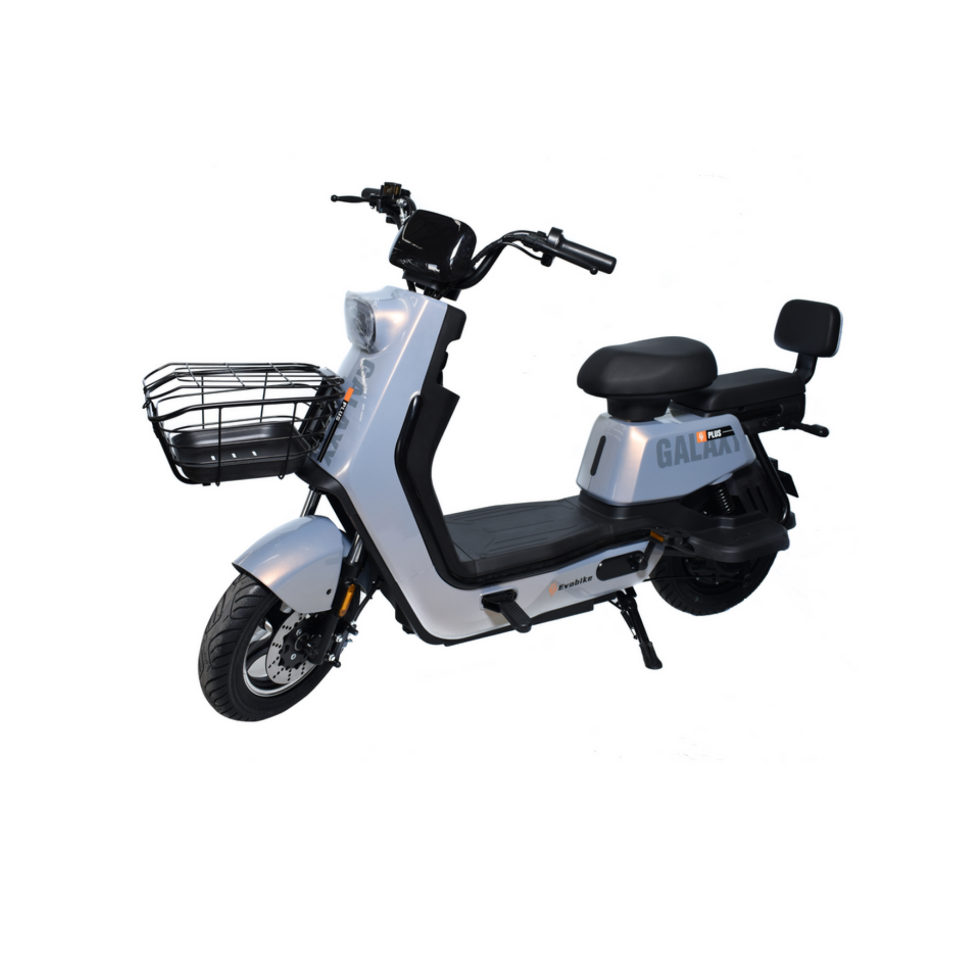 Descubre la bici eléctrica GALAXY PLUS ideal para bikers principiantes, está diseñada para trayectos cortos en la ciudad, es cómoda y ligera de excelente relación calidad y precio, una amplia variedad de colores, cuenta con un faro de luz led, canastilla amplia para guardar objetos, alarma anti robo, tiene capacidad para 2 pasajeros y soporta hasta 110 kg.