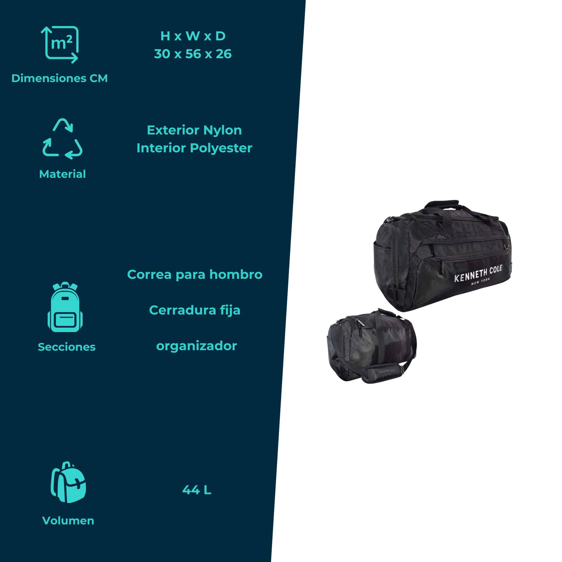 La Duffle Bag Kenneth Cole KNS-00071 es la compañera ideal para viajes, gimnasio o escapadas de fin de semana. Fabricada en nylon duradero con interior de poliéster, cuenta con amplio espacio interior de 44 litros y bolsillo frontal de fácil acceso para artículos esenciales. Su diseño clásico y resistente asegura comodidad y estilo en cualquier ocasión.