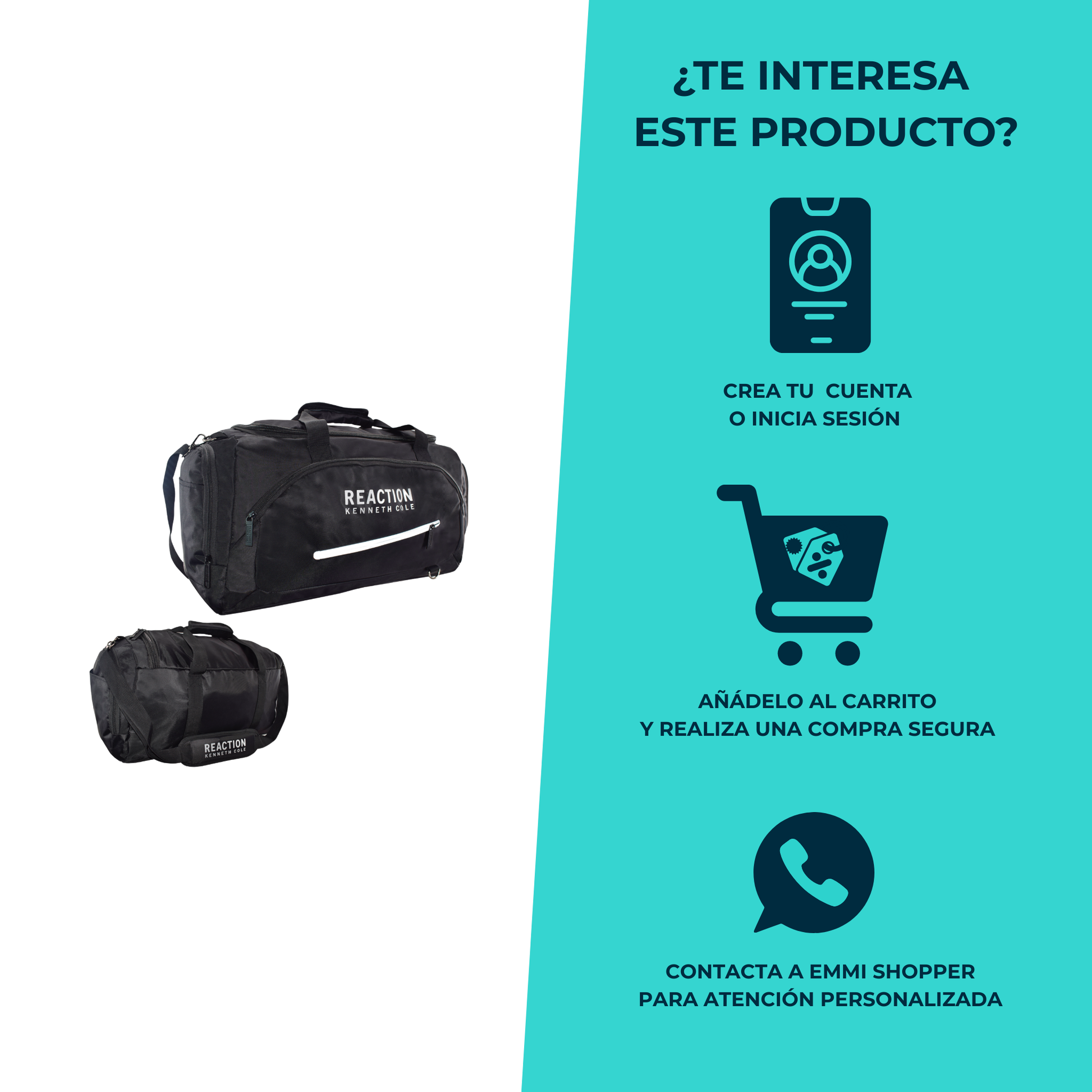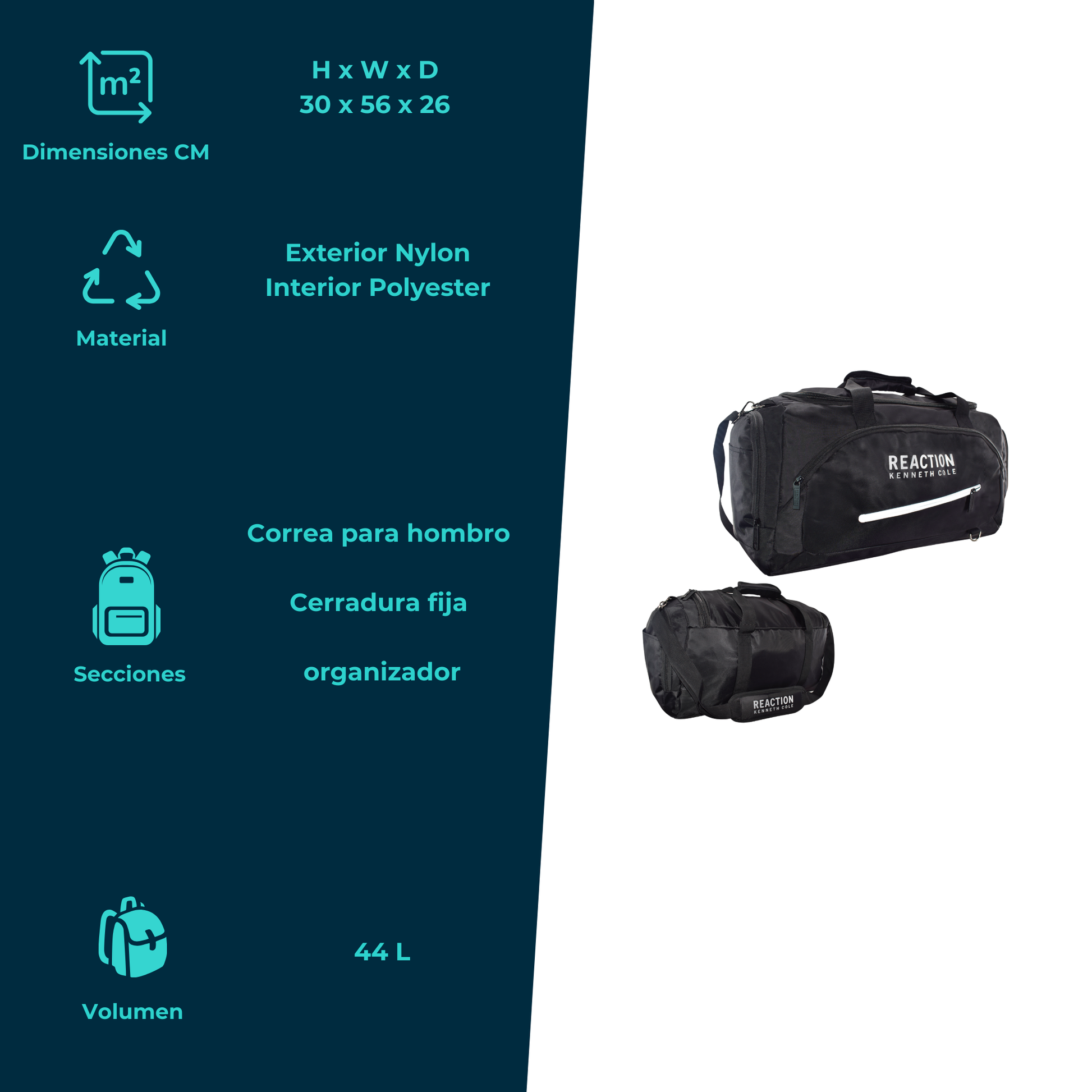 La Duffle Bag Reaction Kenneth Cole RKS-00061 combina resistencia, funcionalidad y estilo para tus viajes o entrenamientos. Fabricada en nylon duradero con interior de poliéster, ofrece un amplio espacio de 44 litros y un práctico bolsillo frontal de fácil acceso para mantener tus artículos a mano. Su diseño versátil la hace perfecta como maleta de mano, bolsa deportiva o de fin de semana.