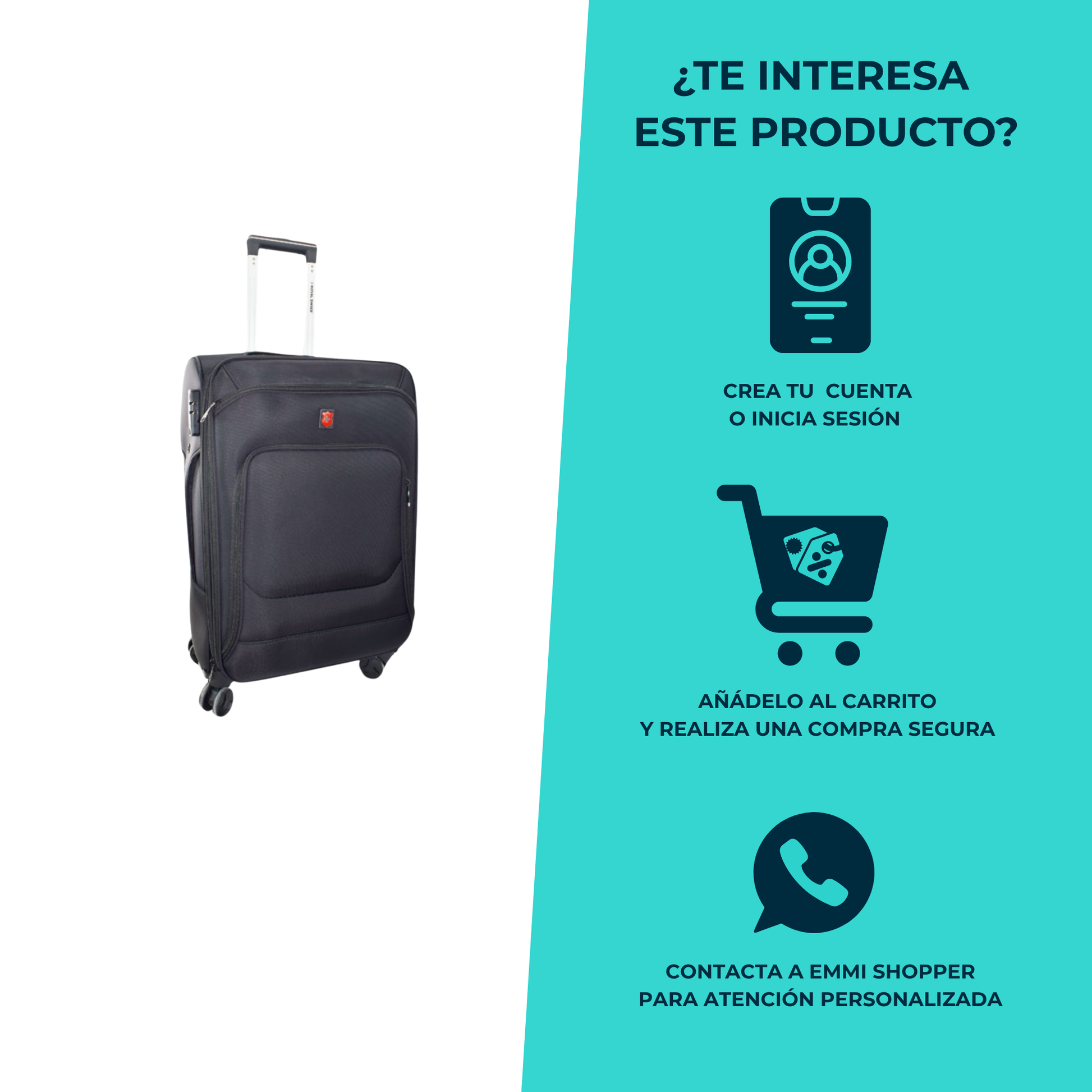 La maleta Interlaken de Royal Swiss es una opción ligera, flexible y funcional para quienes buscan comodidad al viajar. Su diseño en nylon con ruedas giratorias y candado fijo integrado ofrece movilidad y seguridad. Está disponible en tres tallas (18”, 20”, 24” y 28”) y cuenta con cierre expandible para mayor capacidad.