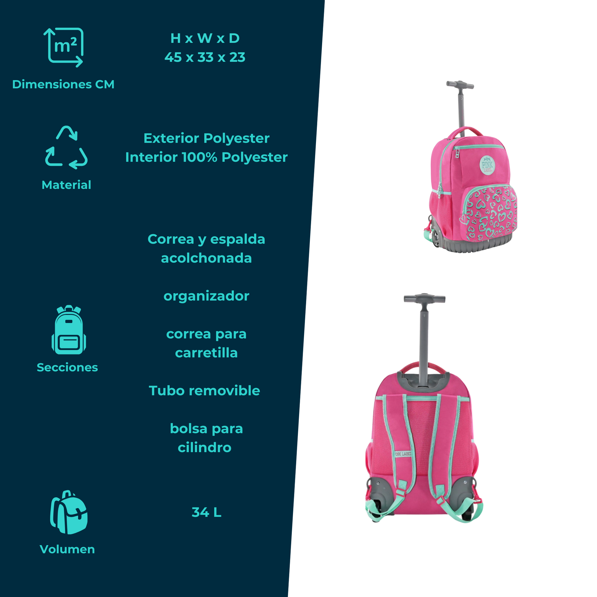 La mochila con ruedas Pink Label 00066 es perfecta para quienes llevan muchas cosas y quieren evitar el peso en la espalda. Su diseño en color rosa intenso con estampado de corazones en menta es tan funcional como encantador.