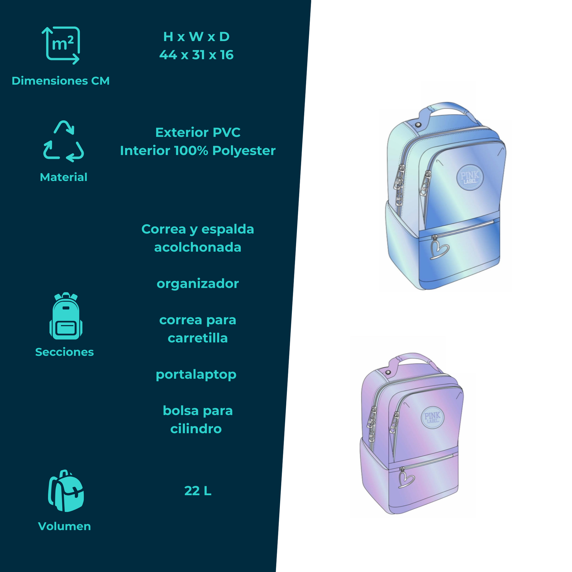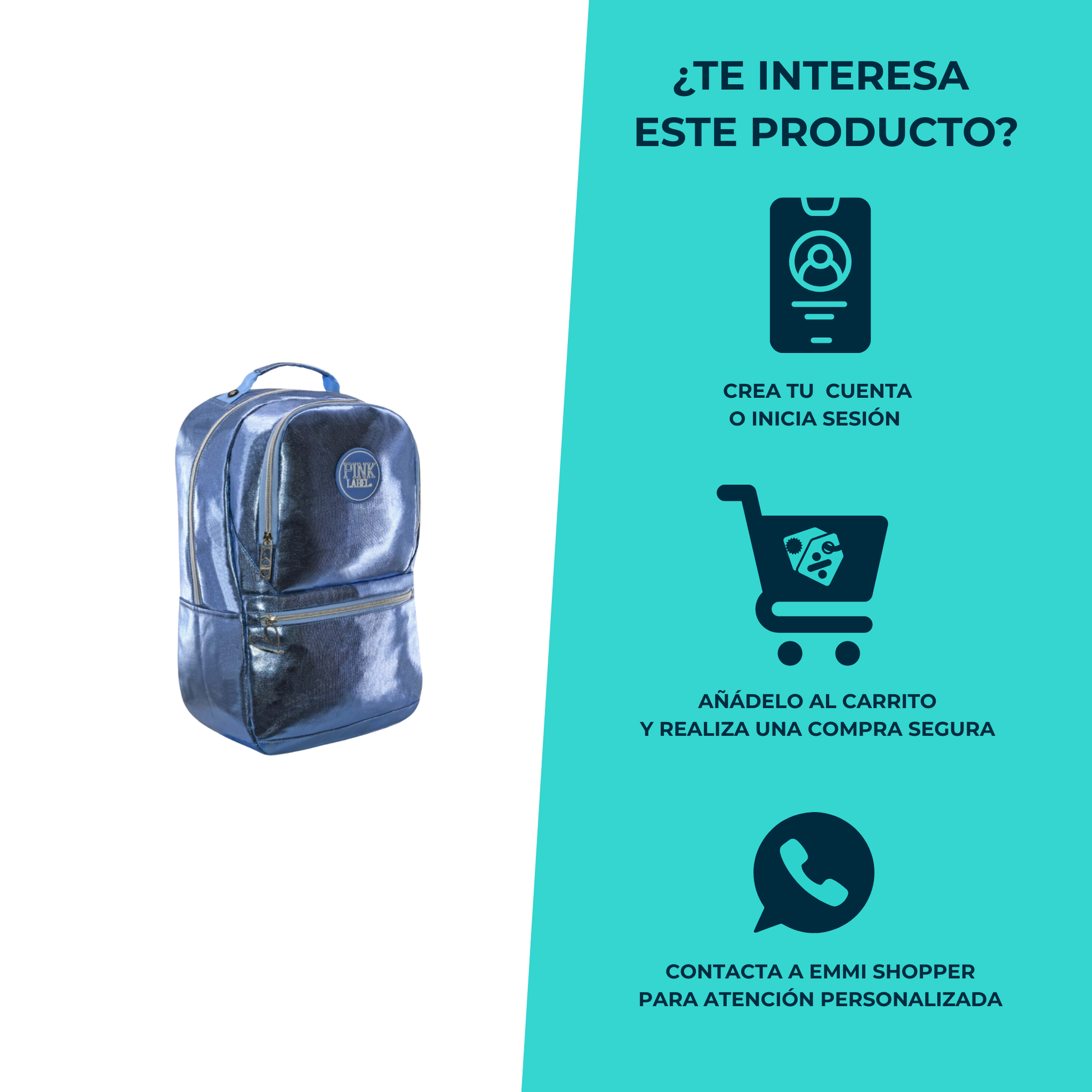 Haz brillar tu estilo con la mochila original Pink Label 00064, con acabado metálico en tono azul y morado, un diseño moderno, juvenil y llamativo. Perfecta para quienes aman destacar con un toque futurista en la escuela o en su día a día.