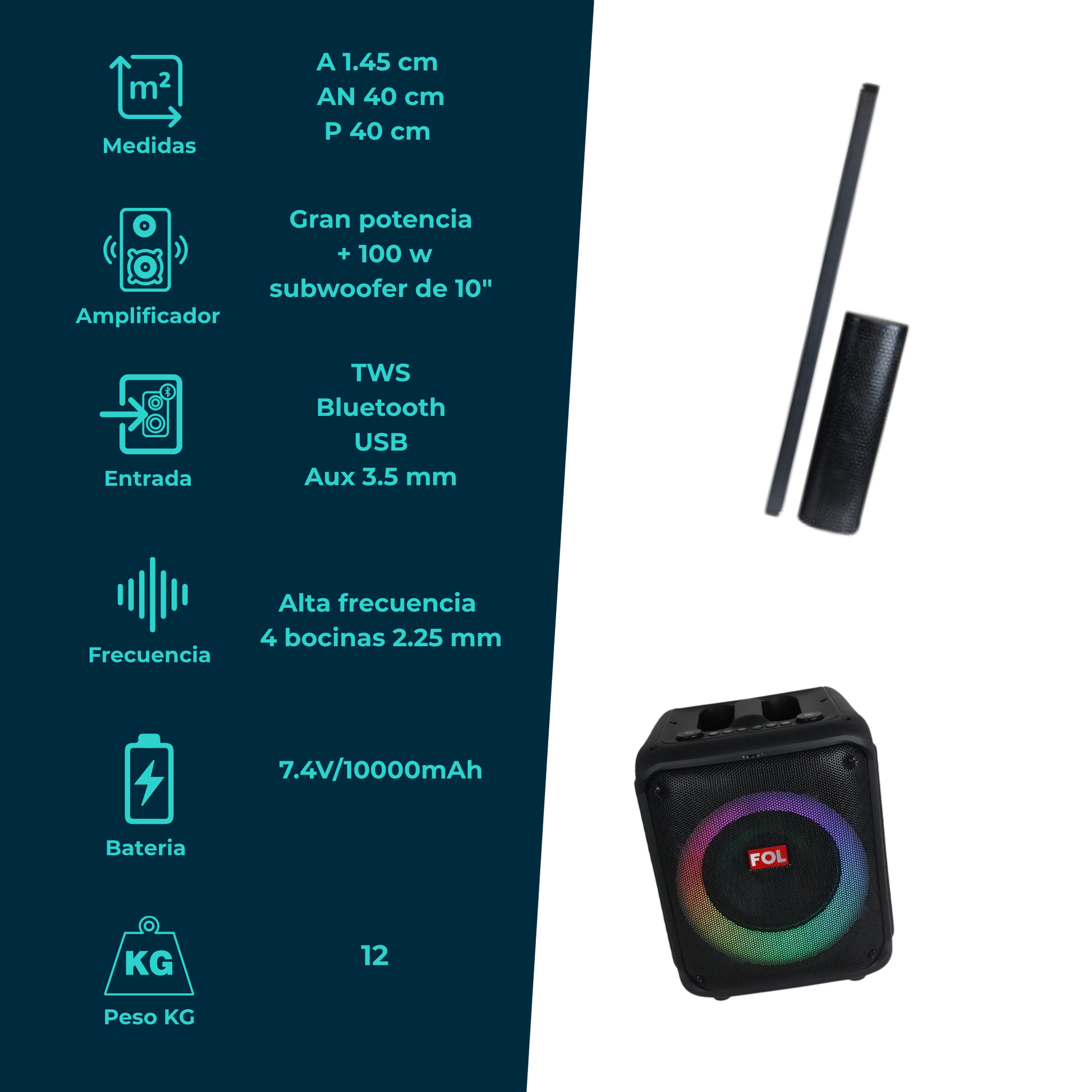 Torre de Sonido Bluetooth 100 W RMS Subwoofer 10″, Iluminación RGB